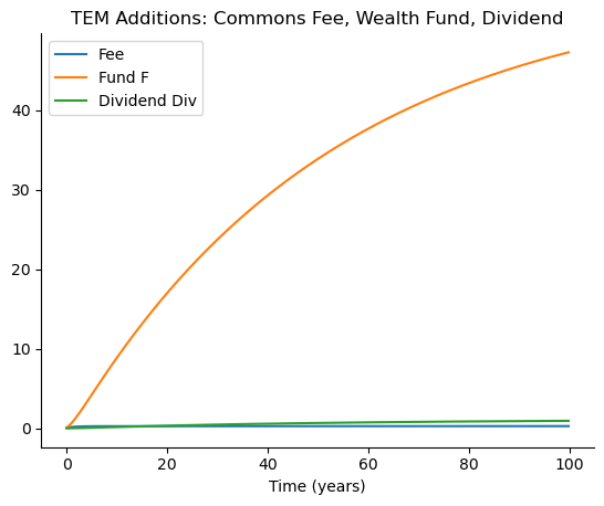 There are no oscillations, crashes, or runaway dynamics. The fund behaves as a stable long-term stock, and the dividend behaves as a delayed, predictable flow.